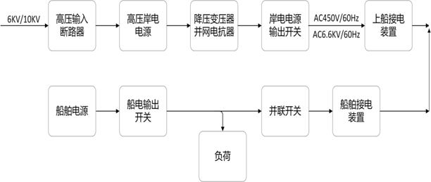 系統通過(guò)岸邊接電箱及柔性電纜將電源送至船舶接電裝置。最后通過(guò)船上的并網(wǎng)裝置實(shí)現與船舶輔機的并網(wǎng),接入船用電系統供全船設備使用。當并網(wǎng)成功后,船舶輔機與岸電電源將自動(dòng)實(shí)現負載轉移,最終船舶輔機停運、船用電氣設備完全由岸電電源供電。