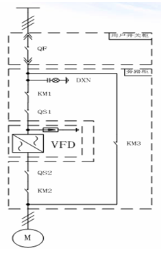 合KM3、分KM1、KM2、為工頻模式。電機可由QF直接啟停并進(jìn)行保護,變頻器可完全和電網(wǎng)脫離。