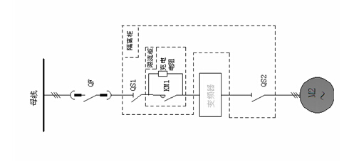 送水泵變頻改造系統包括三部分:隔離柜、限流柜、高壓變頻器。其中隔離柜由兩個(gè)隔離開(kāi)關(guān)組成,當變頻器處于檢修和維護狀態(tài)時(shí),通過(guò)手動(dòng)操作分斷QS1,QS2開(kāi)關(guān),確保檢修過(guò)程的安全性。當需要對電機進(jìn)行絕緣耐壓試驗時(shí),需要將QS2分斷,試驗完畢,再手動(dòng)將QS2合閘。