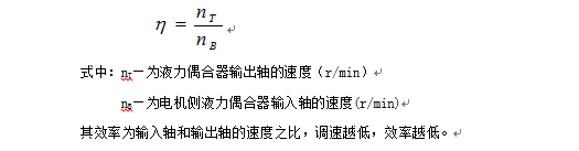 液力偶合器是通過(guò)控制工作腔內工作油液的動(dòng)量矩變化,來(lái)傳遞電動(dòng)機能量,電動(dòng)機通過(guò)液力偶合器的輸入軸拖動(dòng)其主動(dòng)工作輪,對工作油進(jìn)行加速,被加速的工作油再帶動(dòng)液力偶合器的從動(dòng)工作渦輪,把能量傳遞到輸出軸和負載。液力偶合器有調速型和限矩型之分,前者用于電氣傳動(dòng)的調速,后者用于電機的起動(dòng)。調速型液力偶合器效率最大值為95%。液力偶合器的效率計算的公式為: