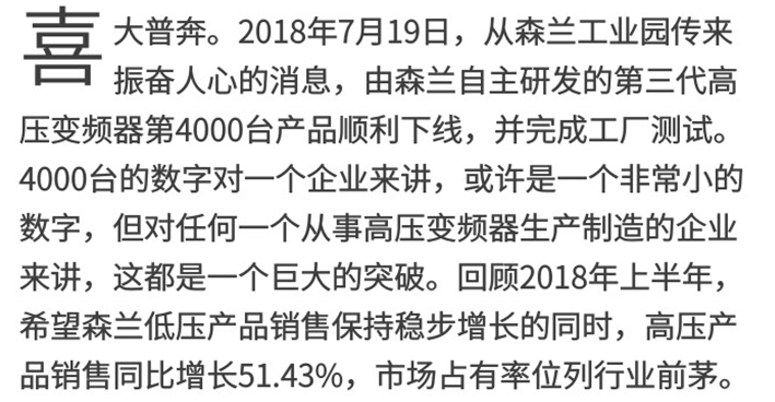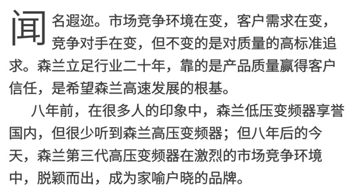 希望森蘭作為節能環(huán)保、新能源、互聯(lián)網(wǎng)傳動(dòng)控制及智能裝備領(lǐng)域的領(lǐng)軍企業(yè),擁有二十年的發(fā)展歷史,集研發(fā)、制造、系統集成、客戶(hù)服務(wù)為一體,產(chǎn)品涵蓋高低壓變頻控制系統、自動(dòng)化生產(chǎn)線(xiàn)及機器人傳動(dòng)控制,EPS電源、港口岸電、多/單晶硅電源等工業(yè)電源系統。為電力、建材、造紙、市政、有色冶金、石油石化、裝備制造與智能制造、港口與機場(chǎng)、軌道交通、新能源、充電集群等行業(yè)提供系統解決方案。秉承“卓越無(wú)境、希望無(wú)限”的經(jīng)營(yíng)理念,二十年的專(zhuān)注和堅持,造就了希望森蘭卓越的品質(zhì),產(chǎn)品遍布中國、俄羅斯、印度、南非、巴西、意大利、丹麥、新加坡、印尼、馬來(lái)西亞、越南、土耳其等30余個(gè)國家和地區。